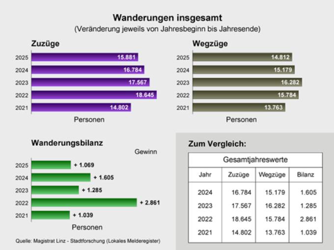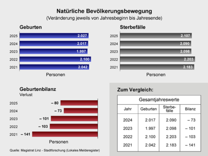 Bei dieser Analyse die Bevölkerungsentwicklung für das Jahr 2025 handelt es sich um eine vorläufige Bilanz der Linzer Stadtforschung. Endgültige Ergebnisse für den Bevölkerungsstand zum 1.1.2026 werden von der Stadtforschung gegen Ende Jänner auf der Homepage der Stadt Linz veröffentlicht.