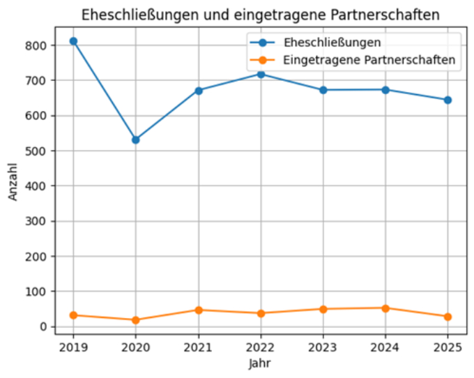 Im Vergleich zu 2024 wurden im Jahr 2025 27 Eheschließungen weniger registriert, während die Zahl der eingetragenen Partnerschaften um 24 sank.
