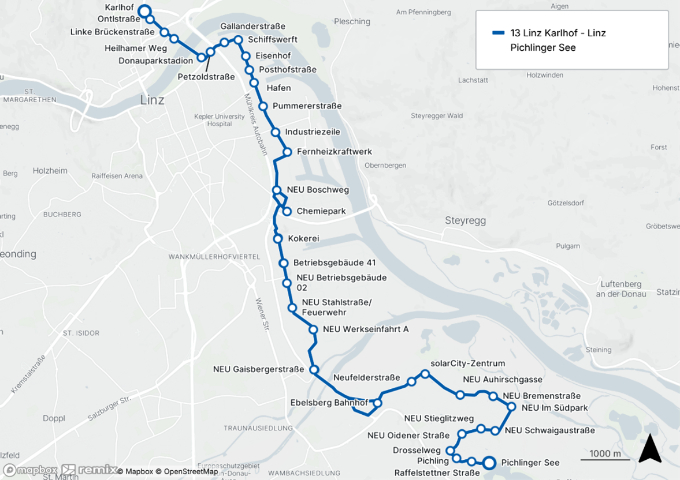Die Inbetriebnahme der neuen Buslinie 13 ist für Herbst 2027 vorgesehen. Sie verbindet den Linzer Süden vom Pichlingersee mit dem Industriegebiet (Voest, Chemiepark, Industriezeile) und führt weiter bis nach Urfahr (Karlhof).