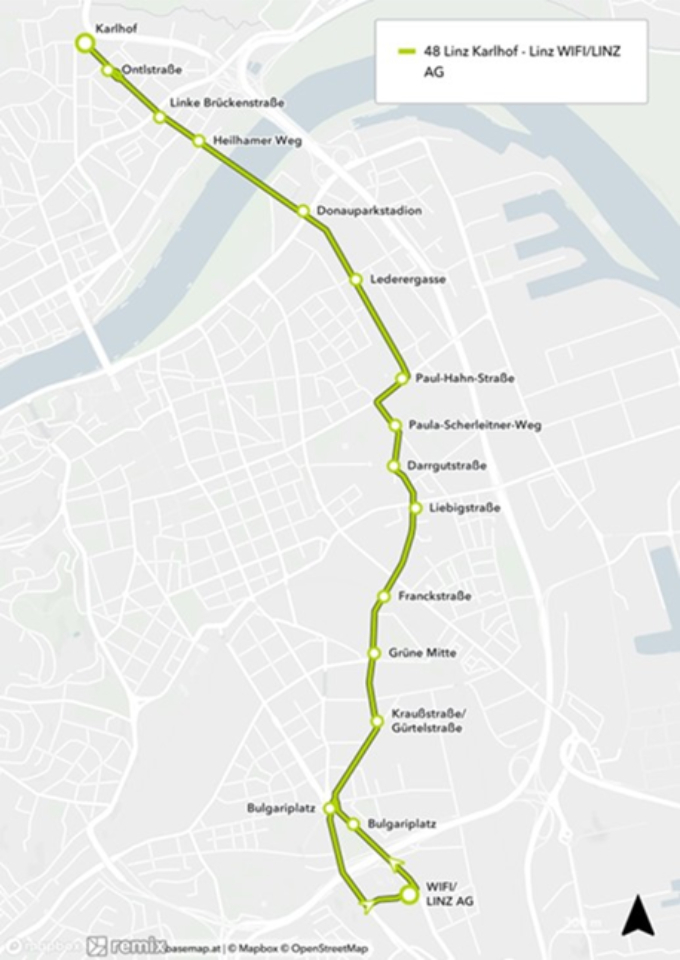 Geführt wird die O-Bus-Linie 48 vom Karlhof, über die Eisenbahnbrücke, die alte Gleistrasse hinter dem Schlachthof, das Krankenhausviertel, das Franckviertel, die Grüne Mitte, den Bulgariplatz bis zum WIFI bzw. der Linz AG.