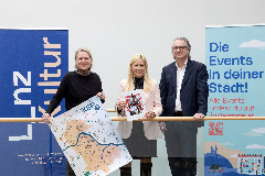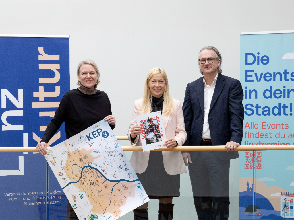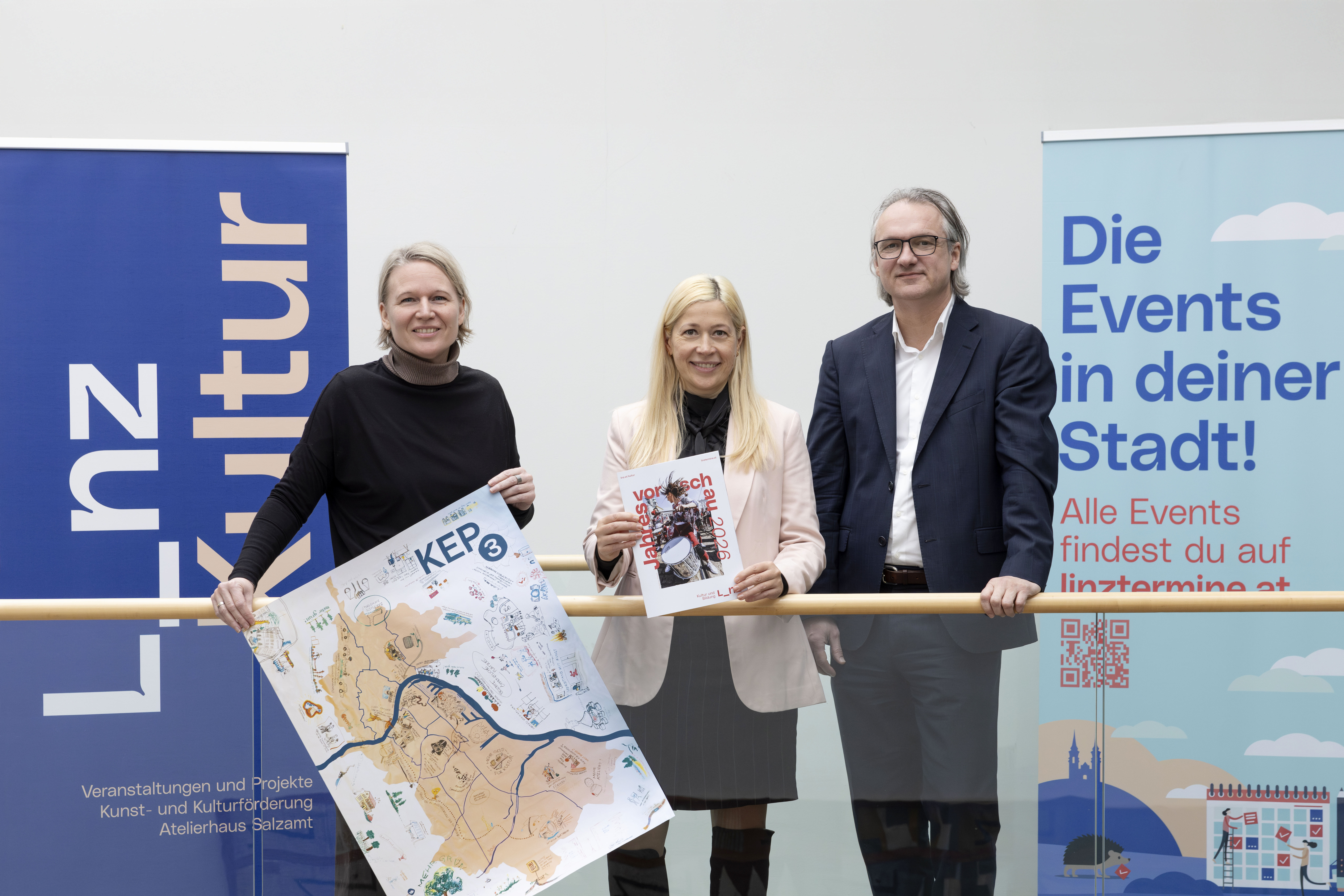 Kulturstadträtin Doris Lang-Mayerhofer mit Linz Kultur-Abteilungsleiterin Mag.a Gerda Forstner und Kulturdirektor Dr. Julius Stieber bei der Präsentation des Jahresprogramms 2026.