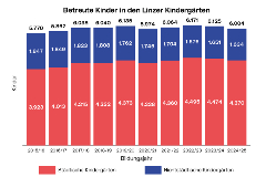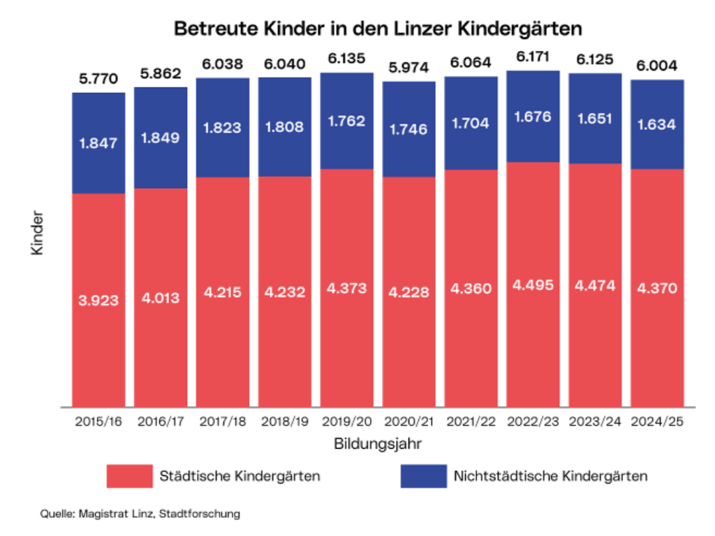 Zuletzt standen in Linz insgesamt 6.928 bewilligte Kindergartenplätze zur Verfügung. Davon entfallen 5.005 Plätze auf städtische und 1.923 auf nicht-städtische Einrichtungen. Für Kinder im Alter von drei bis fünf Jahren stehen 59 städtische und 17 private Kindergärten, 23 Kindergärten der Caritas sowie ein Übungskindergarten des Bundes zur Verfügung. Im laufenden Betreuungsjahr 2025/26 werden aktuell rund 6.100 Kindergartenkinder in Linz betreut, davon etwa 4.500 in städtischen Kindergärten. Der Bedarf kann damit gedeckt werden.
