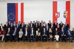 Landeshauptmann Thomas Stelzer (Reihe 1, 6.v.r.) und Bürgermeister Dietmar Prammer (Reihe 1, 7.v.l.) mit den Vertreter*innen des Konsularischen Korps, Ehrengästen und Mitglieder des Linzer Stadtsenates beim Neujahrsempfang im Alten Rathaus.