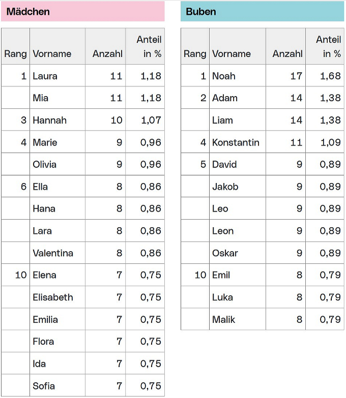 Die Stadt Linz hat ihre aktuelle Vornamensstatistik auf Basis der Linzer Hauptwohnsitzbevölkerung zum Stichtag 1. Jänner 2026 ausgewertet. Bei den Neugeborenen des Jahres 2025 stehen dieses Mal Mia, Laura und Hannah sowie Noah, Adam und Liam an der Spitze. Die vollständige Vornamensstatistik ist auf https://www.linz.at/zahlen/040_Bevoelkerung/090_Vornamen/ abrufbar.