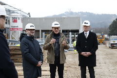 Bürgermeister Dietmar Prammer und Stefan Rutter, Eigentümer und Geschäftsführer der Rutter Immobilien Gruppe, besichtigten mit Dr. Franz Gasselsberger, Generaldirektor Oberbank AG und weiteren Partner*innen und Vertreter*innen der PRO-Mieter*innen das neue PRO (vo. li.)