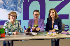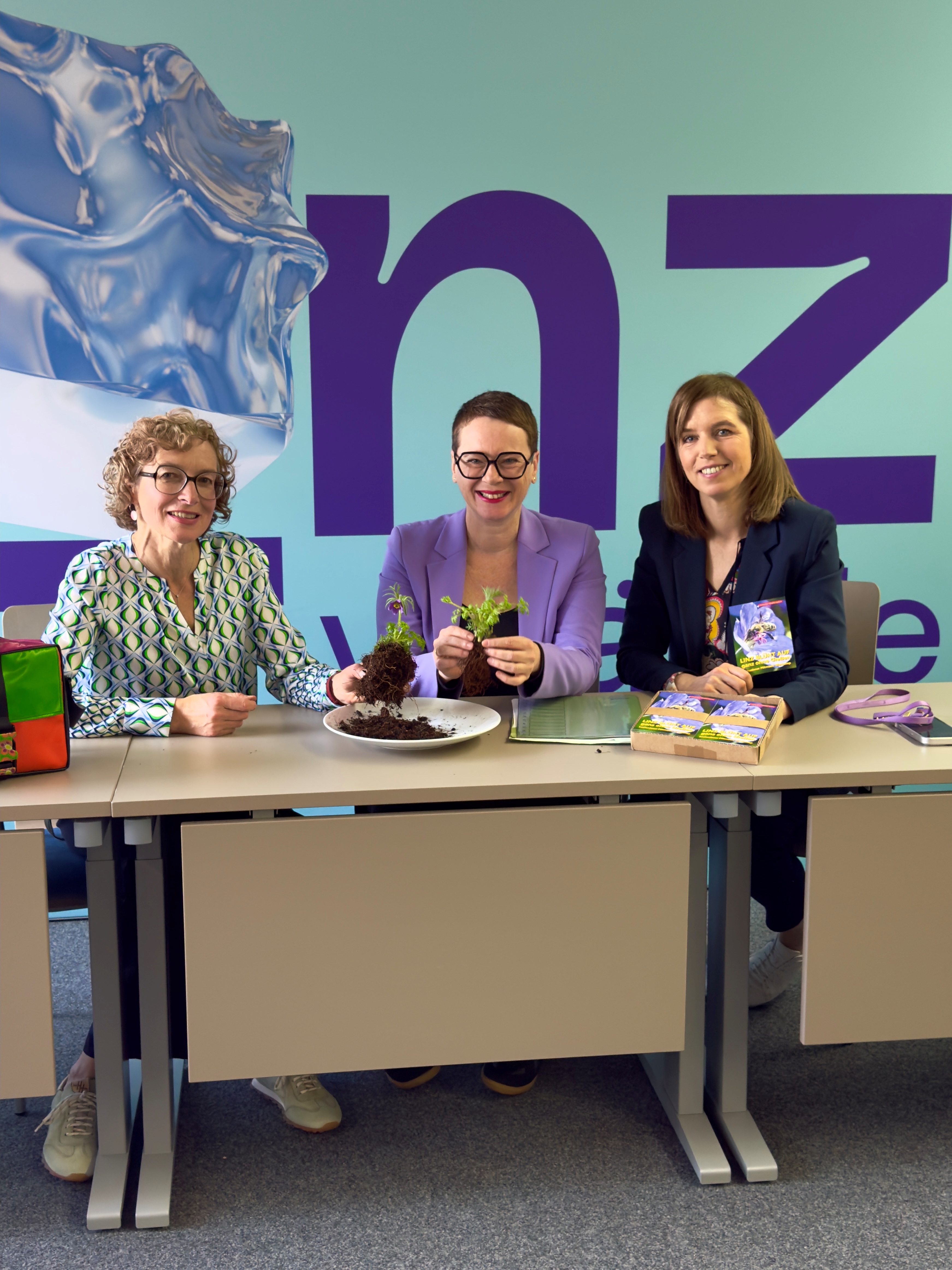 Stellen eine hier noch unbekannte Pflanzmethode vor, die Blumen blühen lässt, ohne zu gießen: vlnr.: Projektleiterin Michaela Köpl, Umweltstadträtin Mag.a Eva Schobesberger, Maria Gottenhuber (Kommunikation & Social Media)