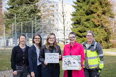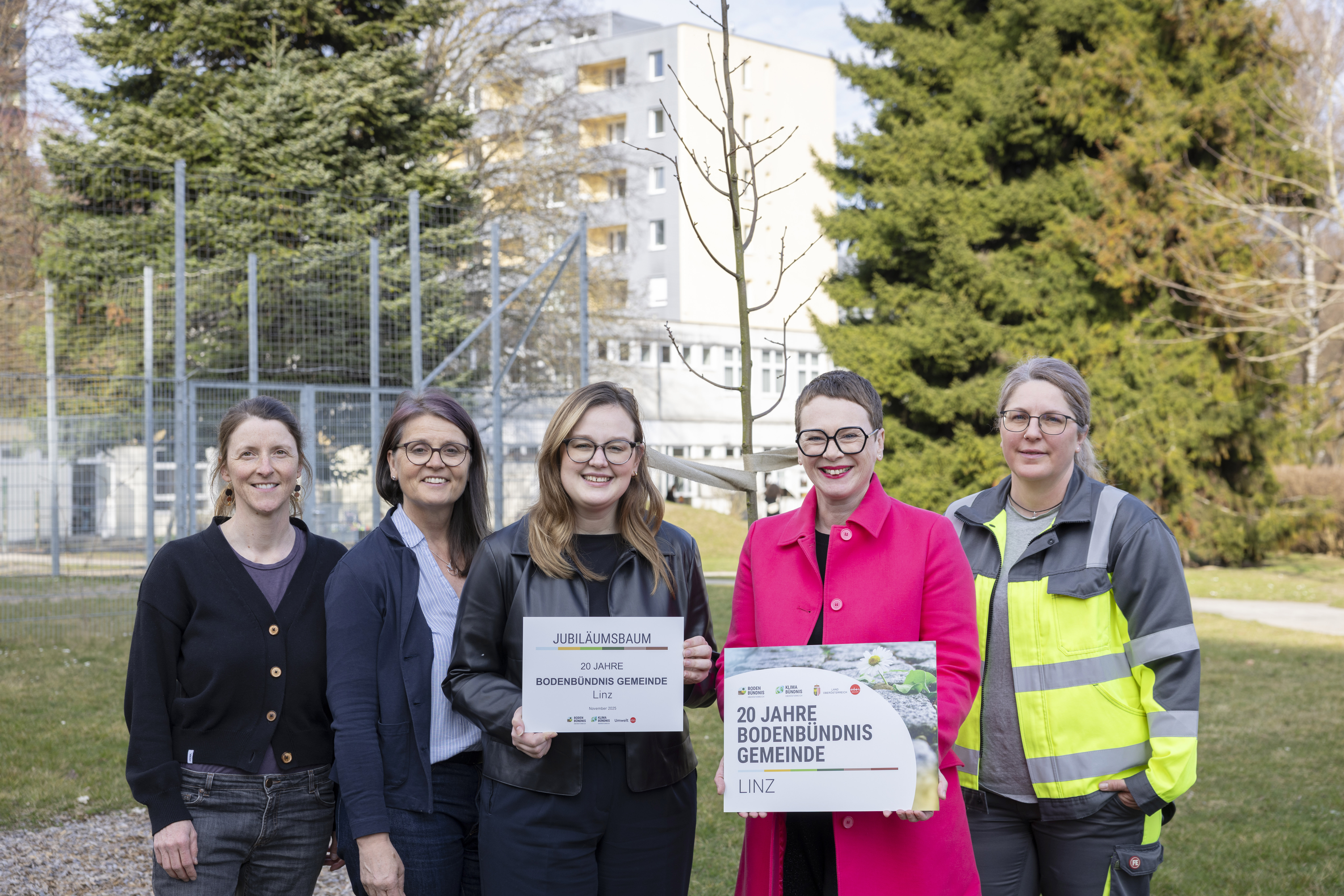 DI Renate Schernhorst (Betreuung Bodenbündnis Gemeinden), Mag.a Gerlinde Larndorfer-Armbruster (Projektleitung Betreuung Bodenbündnis Gemeinden), Liegenschaftsreferentin Vizebürgermeisterin Merima Zukan (3.v.l.), Umwelt- und Bildungsstadträtin Mag.a Eva Schobesberger (2.v.r.) und Marina Stürmer vom städtischen Geschäftsbereich Stadtgrün und Straßenbetreuung (SGS) vor dem frisch gepflanzten Baum vor dem Kindergarten in der Johann-Wilhelm-Klein-Straße.