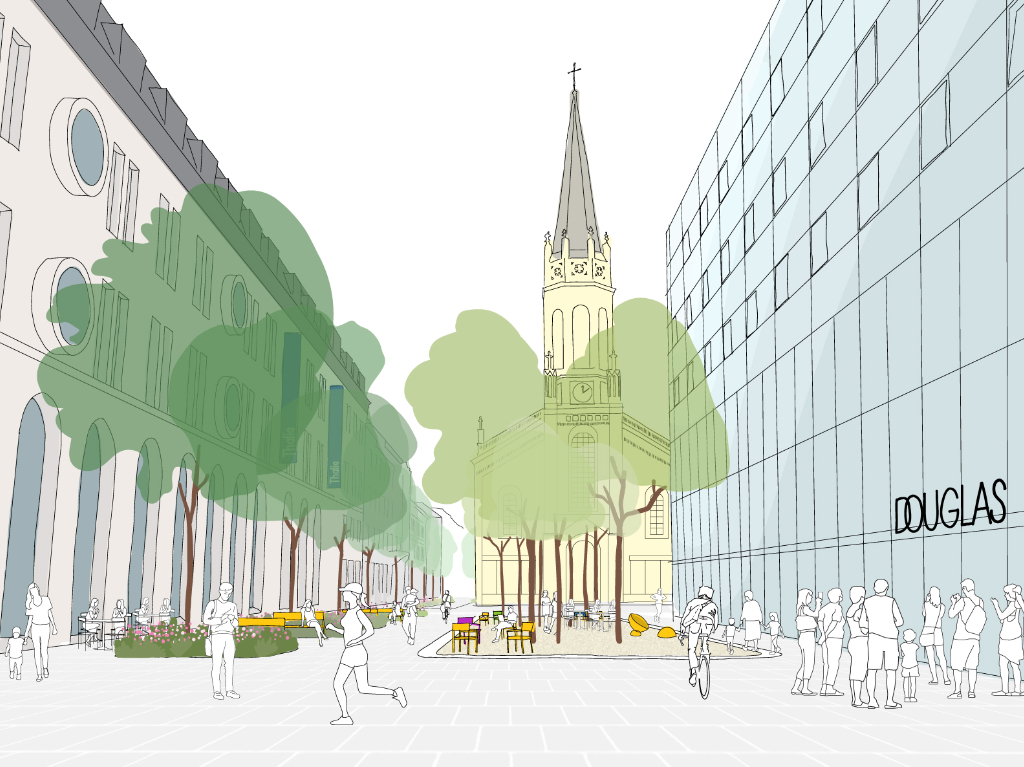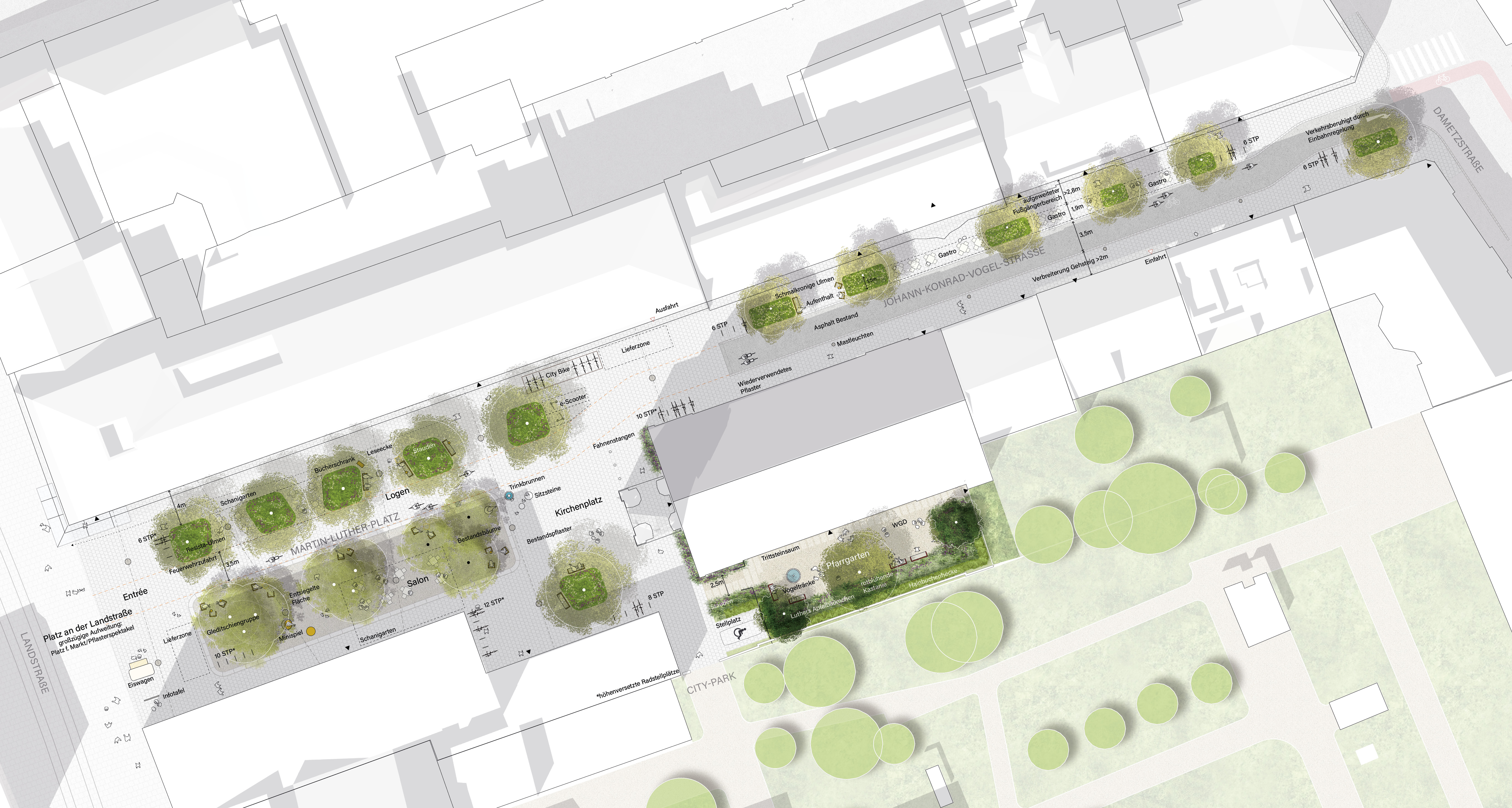 Geplant sind zwölf Pflanzbeete mit schattenspendenden Ulmen, neue Sitzelemente und ein barrierefreier Trinkbrunnen. Am Martin-Luther-Platz entsteht zudem eine entsiegelte, versickerungsfähige Schotterfläche mit neun Gleditschien, darunter drei bestehende Bäume. Die neuen Baumstandorte folgen dem Schwammstadtprinzip und speichern Regenwasser, das langsam an den Stadtraum abgegeben wird.