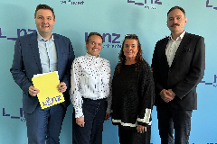 Gesundheitsstadtrat Dr. Michael Raml, Suzan Reitsema (Team Gesundheit und Sport), Mag.a Dagmar Luft (Bereichsleitung Gesundheitsförderung) und Mag. Ulrich Püschel (Direktor Geschäftsbereich Gesundheit und Sport) präsentieren die Zwischenbilanz der Gesundheitsstrategie.