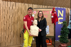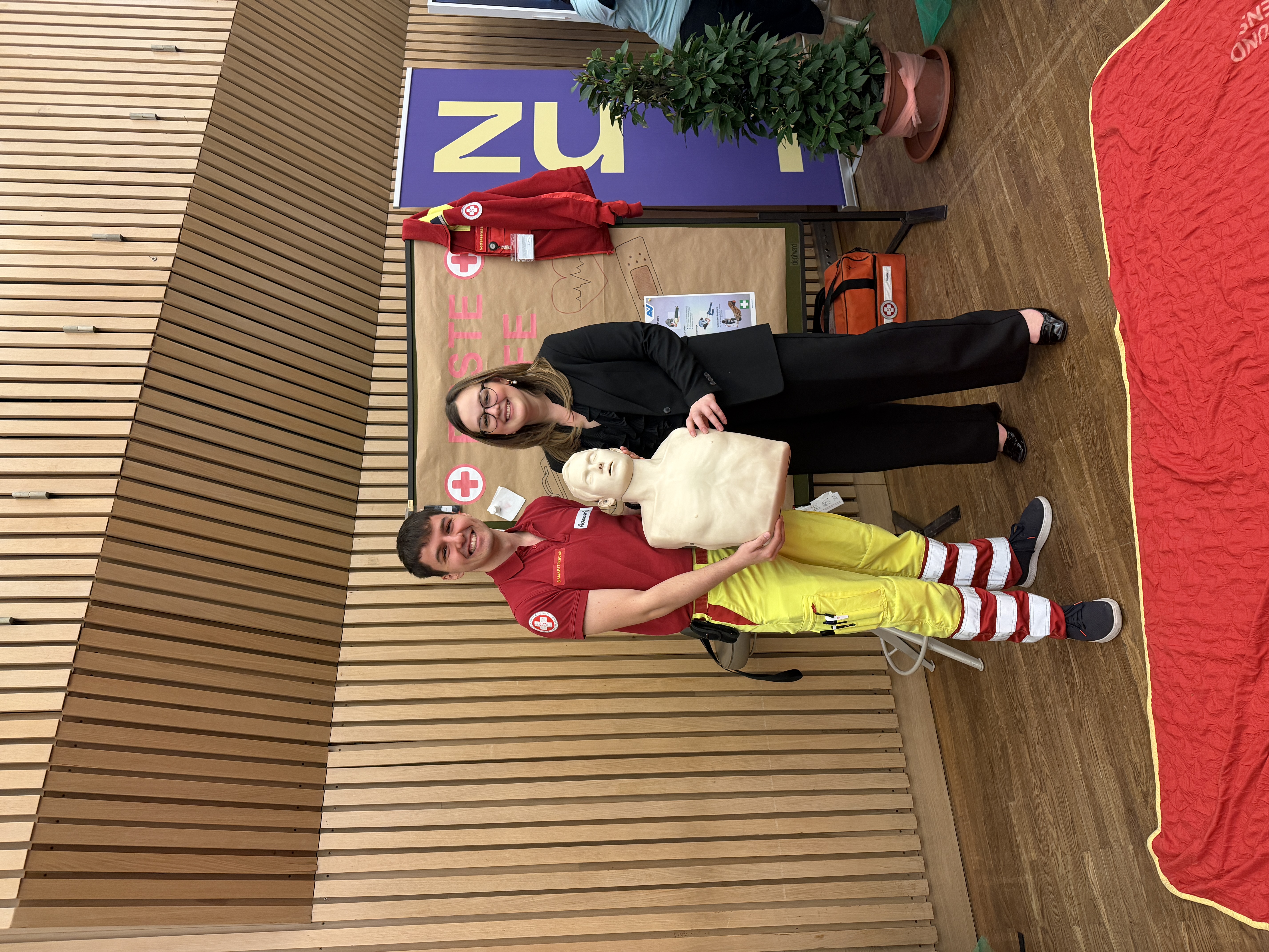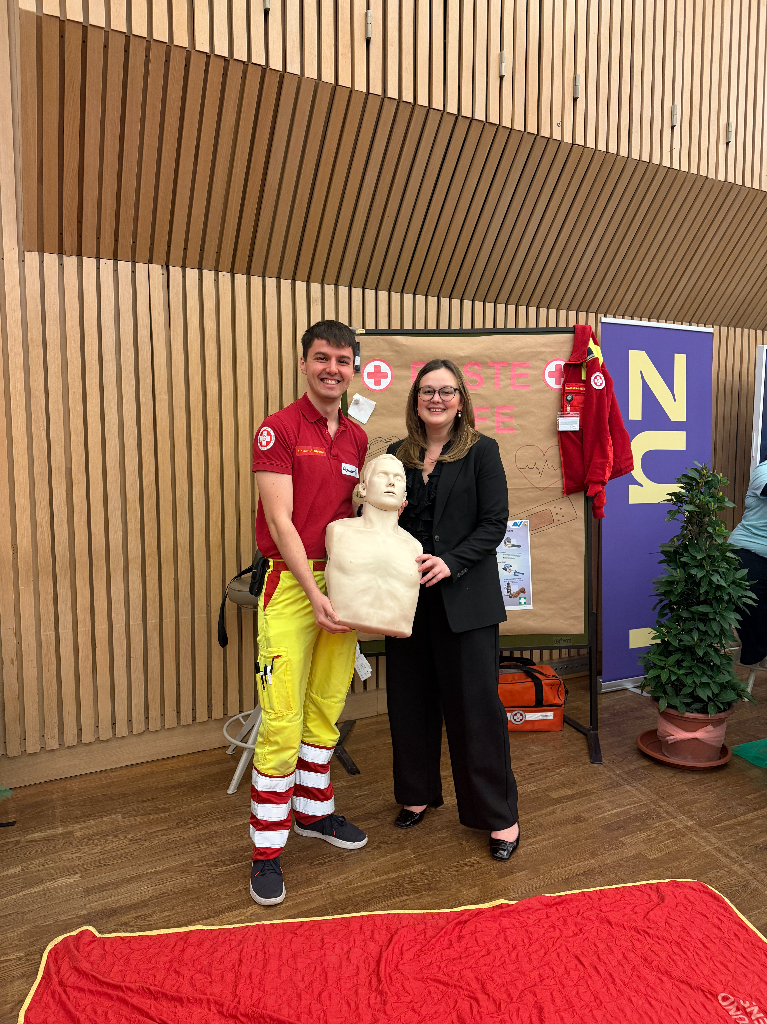 Auch Vizebürgermeisterin Merima Zukan frischte beim Gesundheitstag im Neuen Rathaus ihr Erste-Hilfe-Wissen auf – inklusive kurzer Herzdruckmassage-Schulung mit dem Samariterbund Linz.