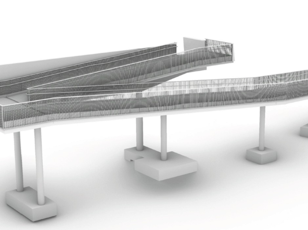 Für die Verbreiterung setzt die Stadt auf das bestehende Stahlbetontragwerk auf und montiert acht vorgefertigte Stahlsegmente. Diese Bauweise hält die Bauzeit kurz und verkürzt die Sperre der Rampe. Ein neues, schlankes Stabstahlgeländer verbessert die Sichtbeziehungen auf der Rampe und zum Uferbegleitweg. Das erhöht die Transparenz und stärkt die Verkehrssicherheit. Eine LED-Beleuchtung im äußeren Handlauf sorgt gemeinsam mit der vorhandenen Umgebungsbeleuchtung für gute Sicht.