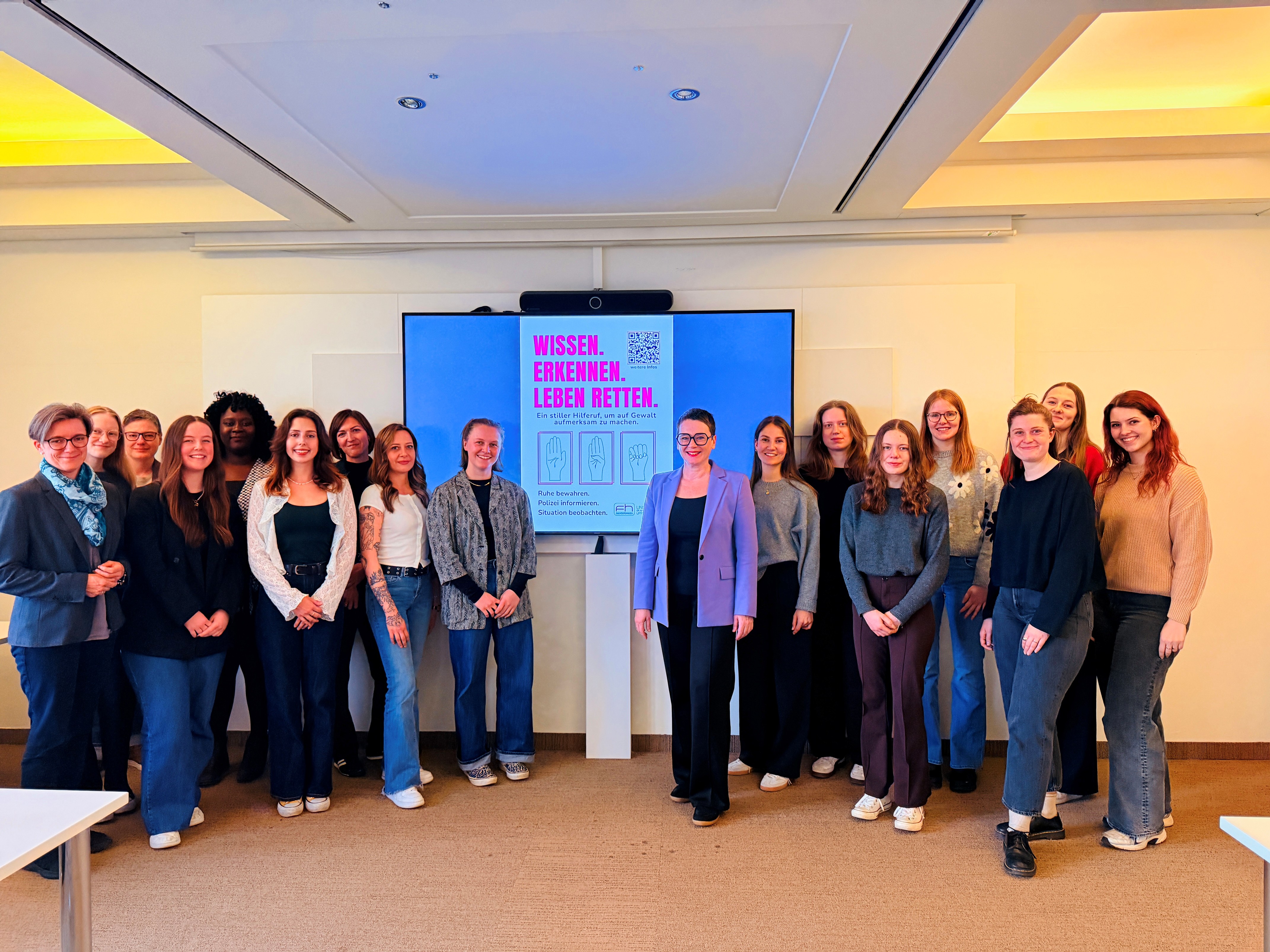 Im Rahmen einer Projektwerkstatt haben 19 Studierende des Departments Soziale Arbeit am Campus Linz der FH Oberösterreich mit Begleitung von Kursleiterin Julia Hauser BA, MSc mit außergewöhnlichem Engagement ein umfassendes Projekt zur Bekanntmachung des internationalen Notfallhandzeichens umgesetzt und damit einen wichtigen Beitrag im Kampf gegen Gewalt gegen Frauen geleistet.