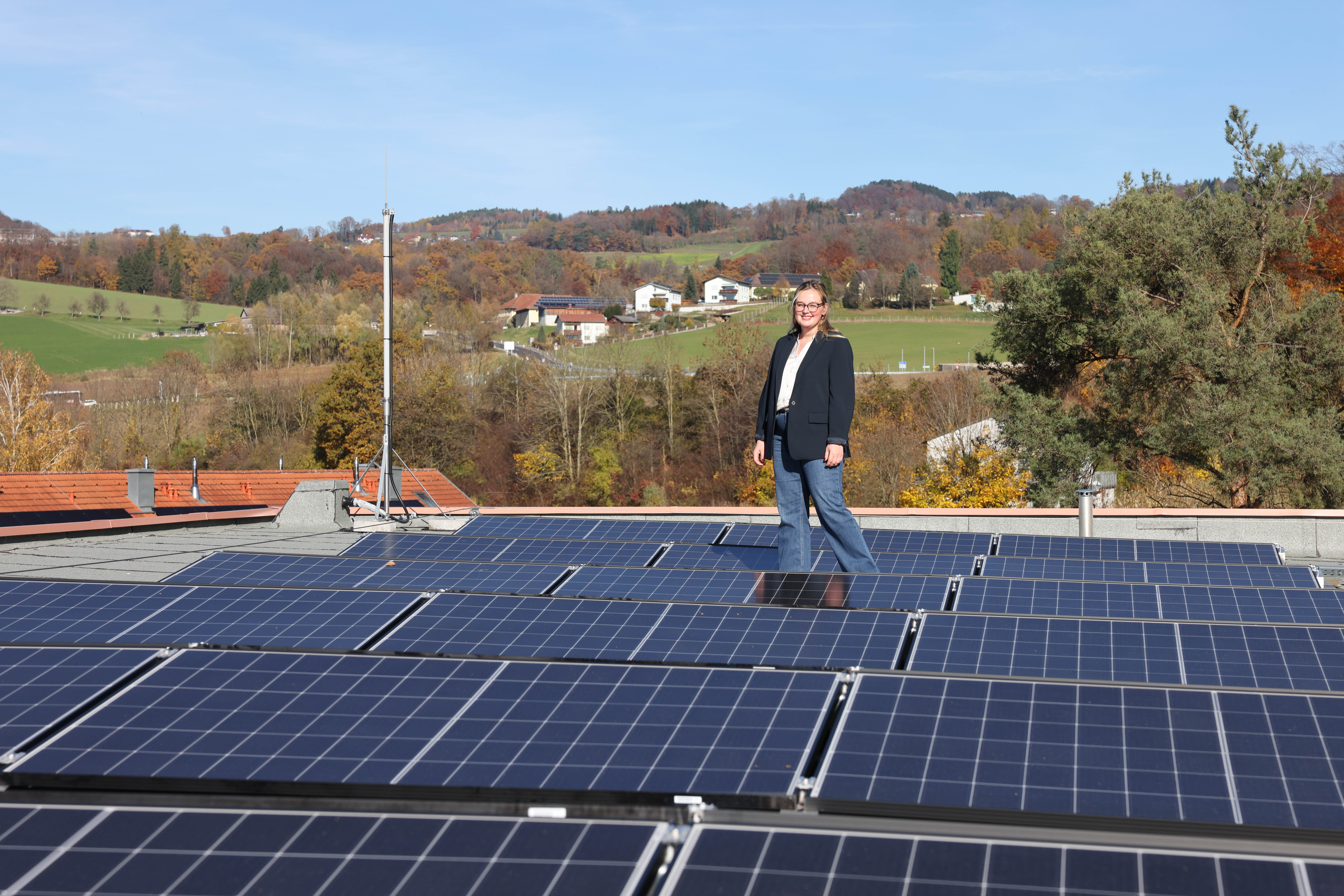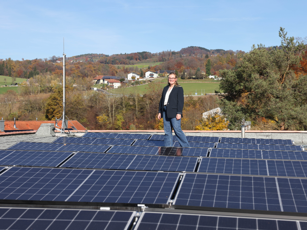 Vizebürgermeisterin Merima Zukan auf dem Dach der Mira-Lobe-Schule, wo eine Photovoltaik-Anlage zur städtischen Eigenversorgung mit erneuerbarer Energie beiträgt.