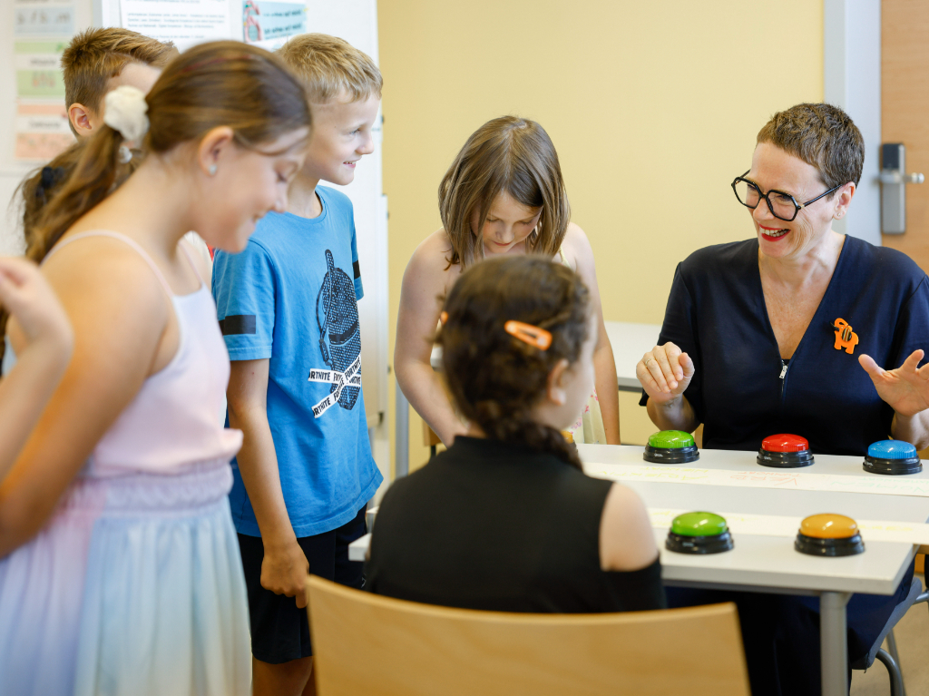 Bildungsstadträtin Mag.a Eva Schobesberger mit teilnehmenden Schüler*innen beim spielerischen Lernen in der Summer School im Wissensturm.