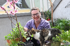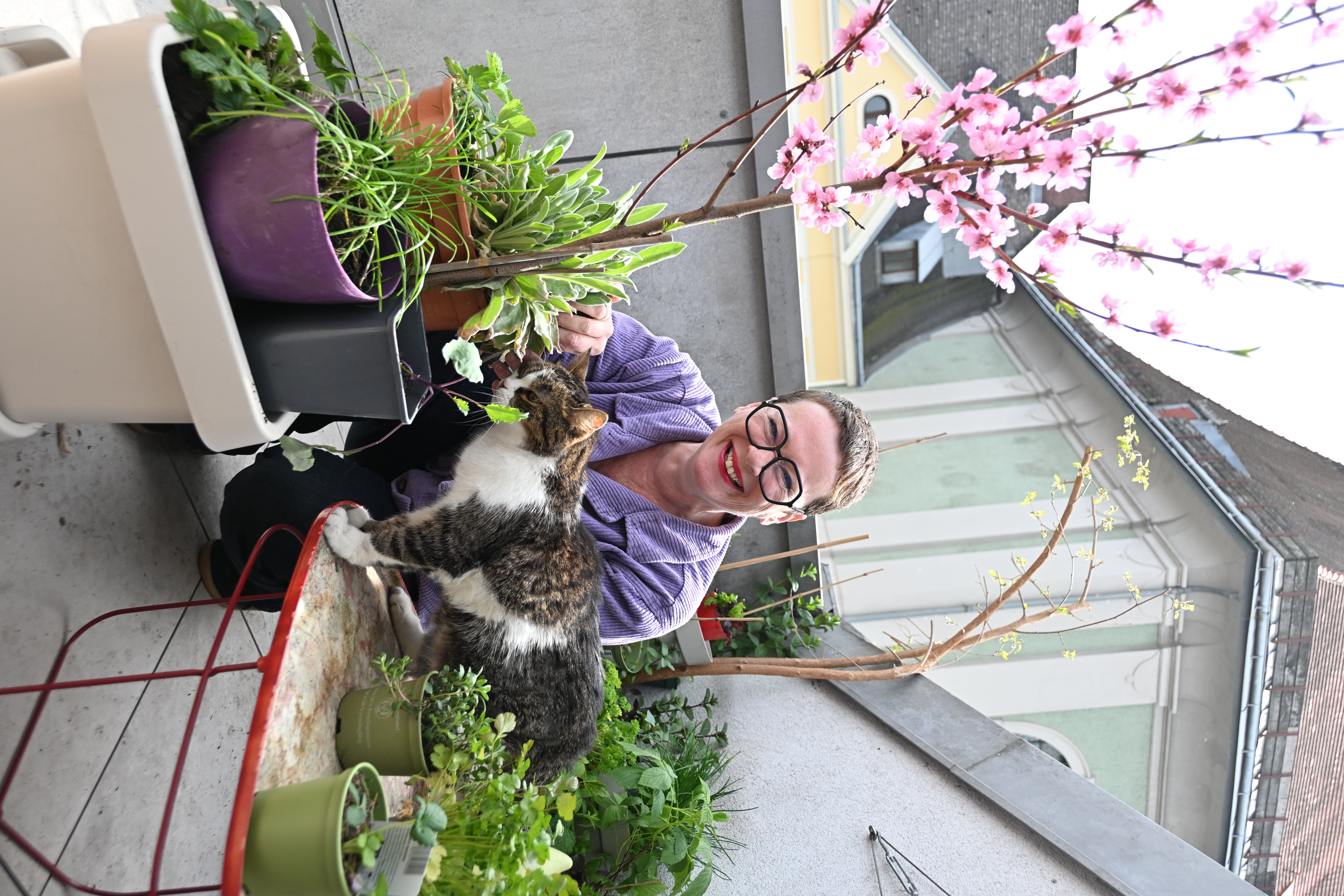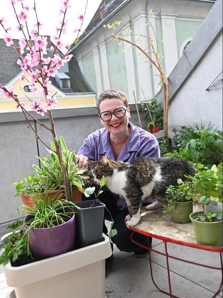 Stadträtin Eva Schobesberger und Kater Gusti sind begeisterte Balkongärtner*innen.
