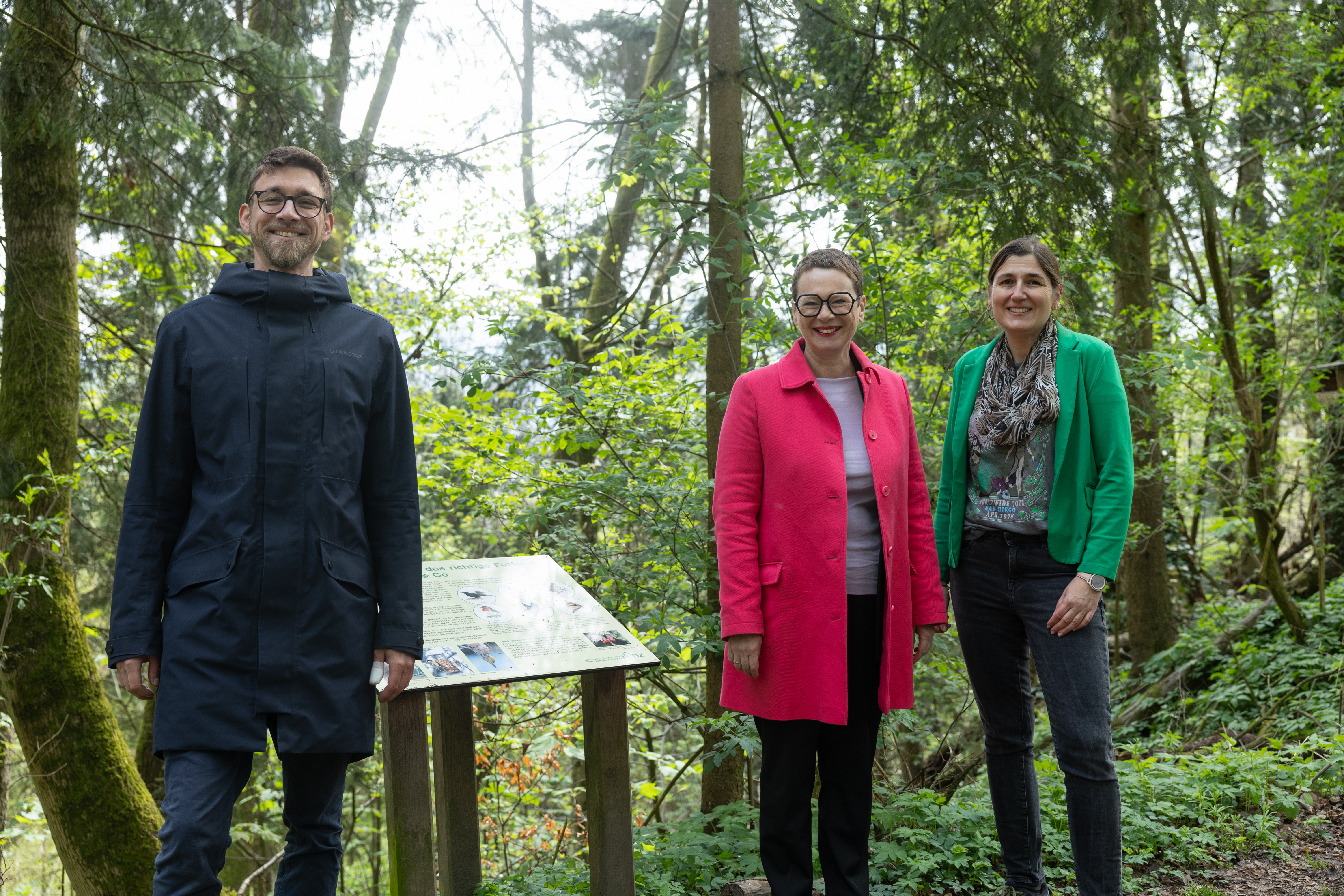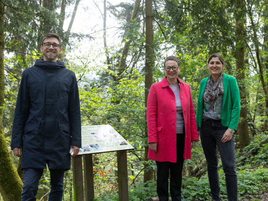 (v.l.): Leiter des Botanischen Gartens Thomas Schiefecker, MSc, Umweltstadträtin Mag.a Eva Schobesberger und Mag.a Gudrun Fuß, Mitarbeiterin der Naturkundlichen Station am Neu gestalteten Naturlehrpfad in St. Magdalena.