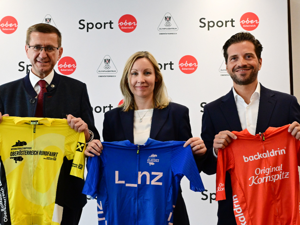 V.li.n.re.: Wirtschafts- und Sport-Landesrat Markus Achleitner, Vizebürgermeisterin Karin Leitner und OÖRSV-Präsident Mario Rossmann freuen sich auf eine tolle Rundfahrt.