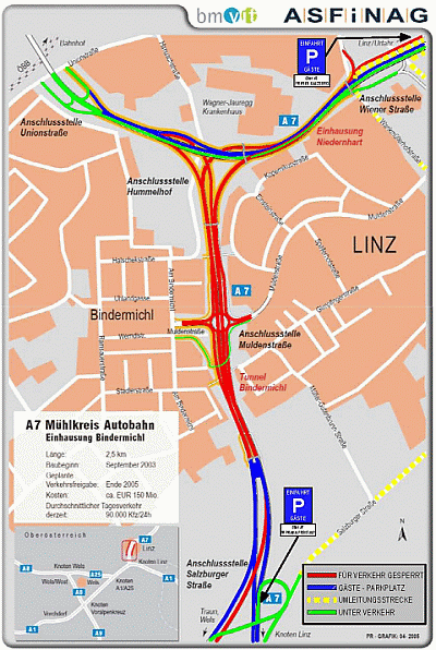 Die A 7 Einhausung Bindermichl bildet den Startschuss für die große Linzer Verkehrslösung. Die Gesamtfertigstellung wird nun bereits am 26. November 2005 - um mehr als drei Wochen früher als geplant - erfolgen.- Sonntag, 20. November 2005 - Tag der offenen Tür - 10 bis 14 Uhr