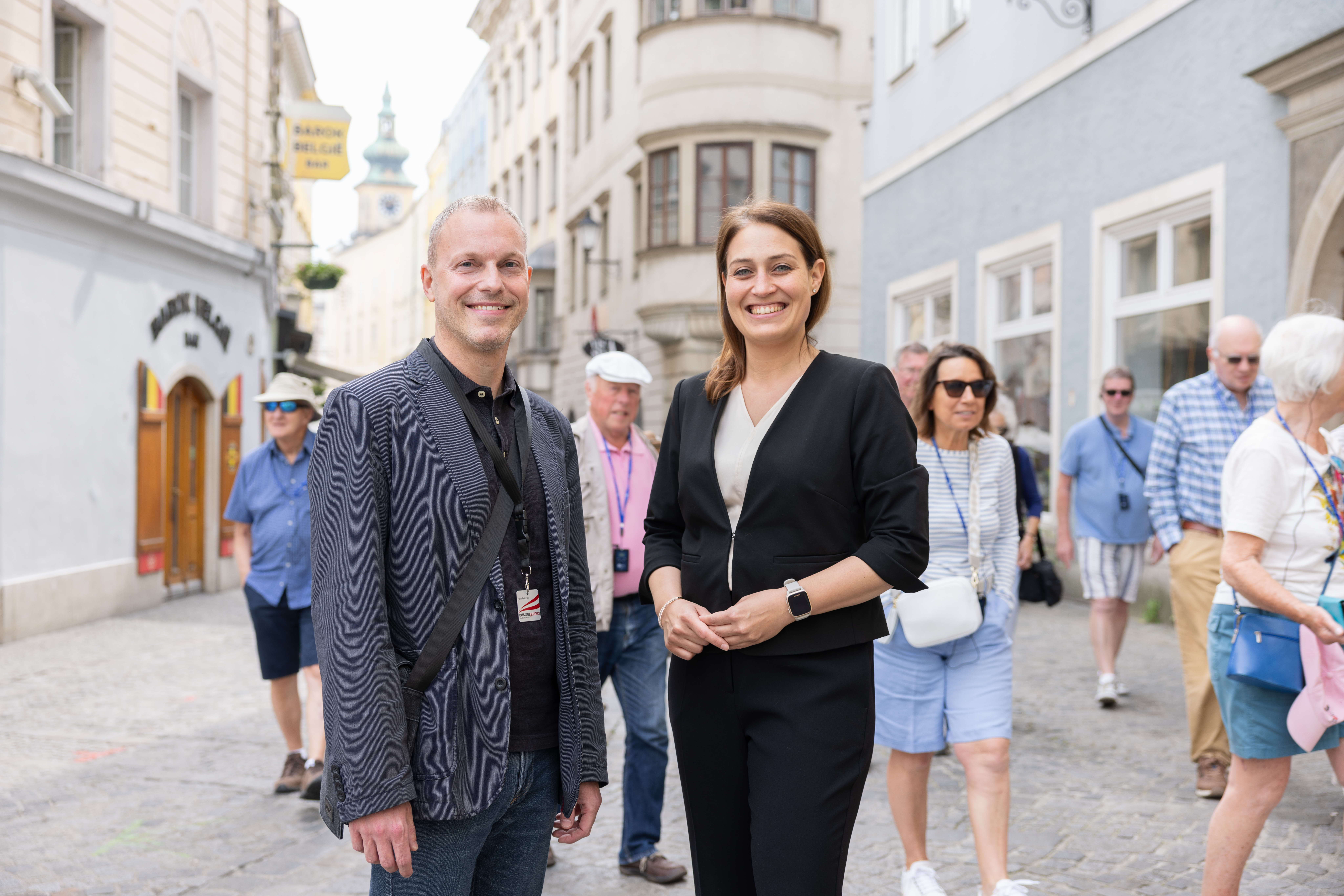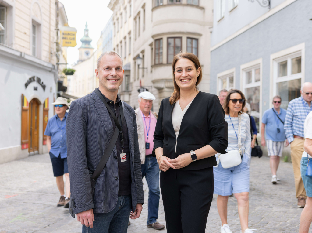 Guide Franz Peterseil und Vizebürgermeisterin Tina Blöchl am Hofberg, einer Station der Queer City Walks