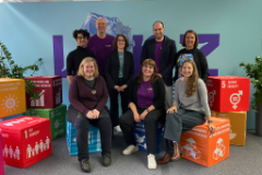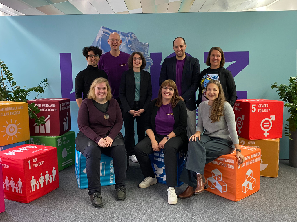 Hinten stehend v.l.n.r.: Amir Bastani (Kunstuniversität), Thomas Gegenhuber (JKU), Denise Halak (Tabakfabrik), Oliver Schrot (Abt. Wirtschaft, Innovation, Klimaschutz & EU), Nina Gruber (tech2b)