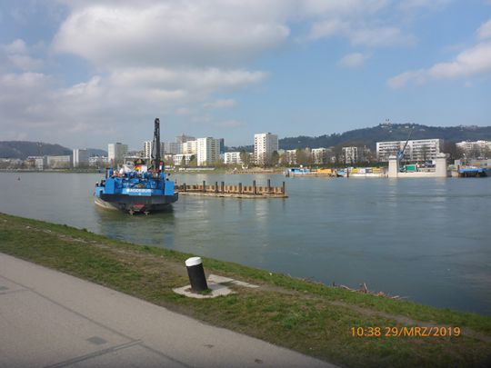 Das Baggerschiff für den geplanten Abbruch der Brückenpfeiler traf am 6. August ein. Ab der zweiten Augustwoche wird mit den Abtragungsarbeiten begonnen. Anschließend erfolgen die Herstellung des Widerlagers und die Herstellung der Bohrpfähle für den Vorlandpfeiler Urfahr.