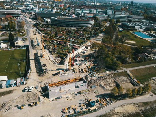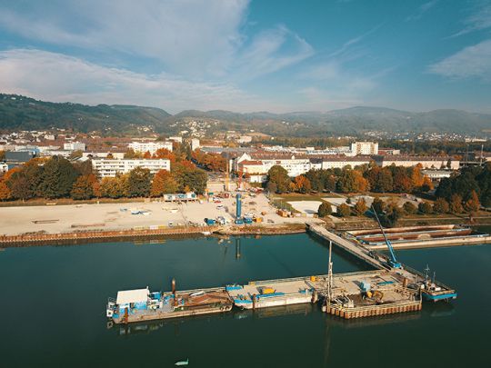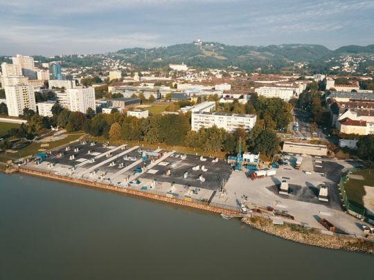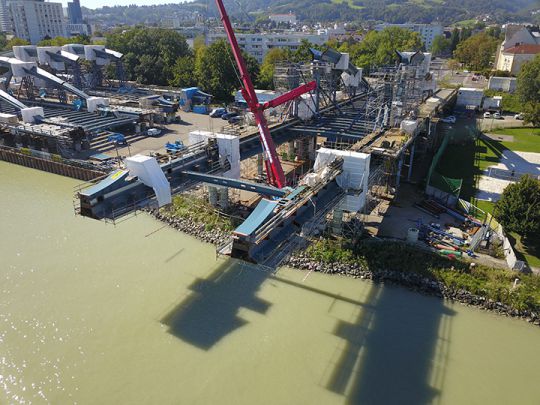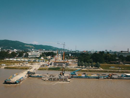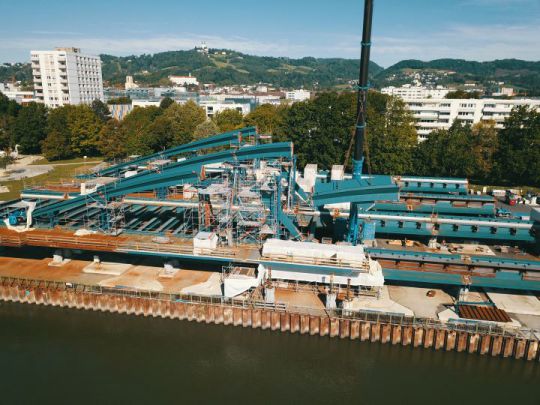 Diese Aufnahme lässt die enormen Dimensionen der künftigen neuen Donaubrücke Linz erkennen.