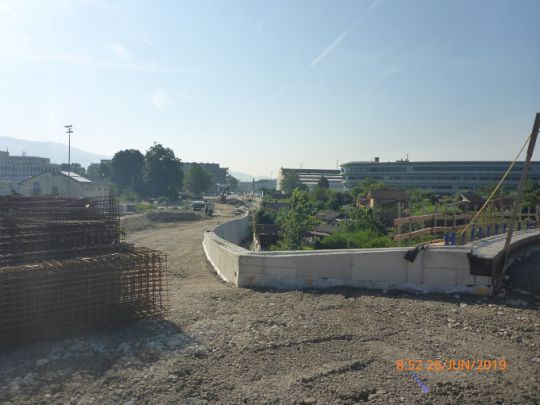 Es erfolgt die Herstellung der Randbalken auf den Stützmauern auf der „Linzer“ Seite zusammen mit Straßenbauarbeiten. Ebenso wird die Herstellung von Hilfsfundamente und Fahrbahnen am Vormontageplatz fortgeführt.