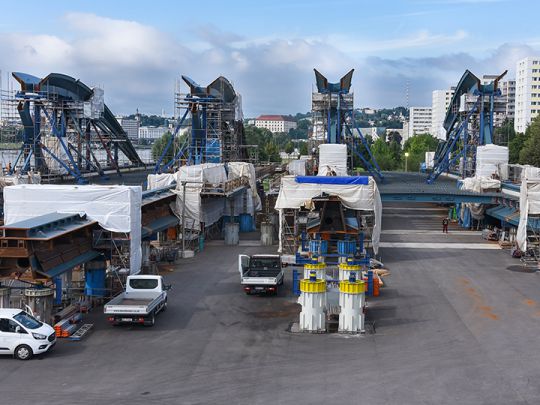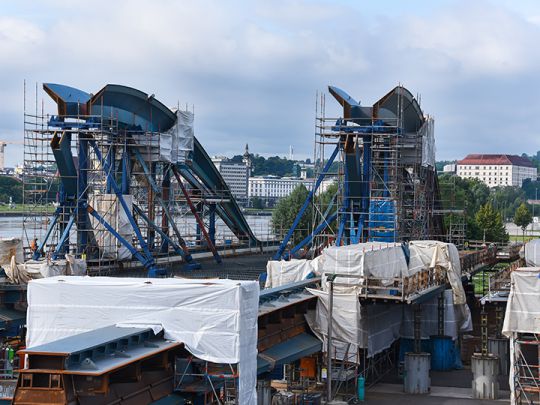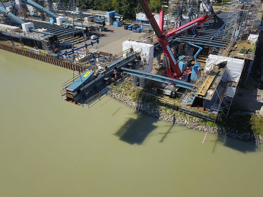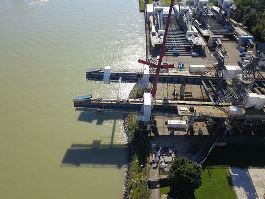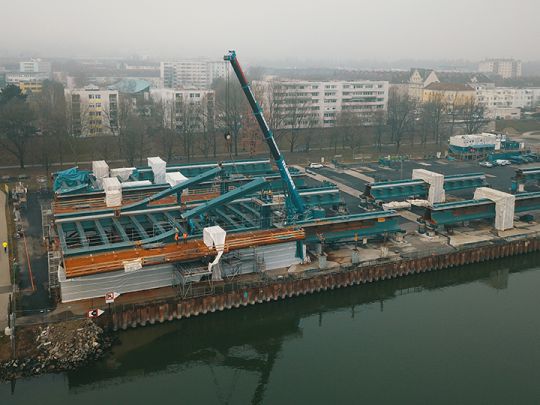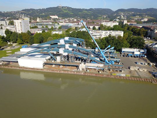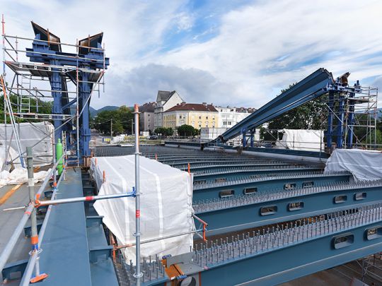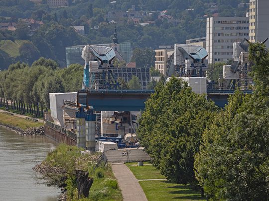 Dicht an dicht liegen die Stahlteile am Donauufer und werden Schritt für Schritt zusammengefügt.