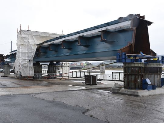 Der an Land befindliche Brückenbogen kurz vor dem Lückenschluss.