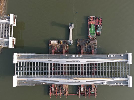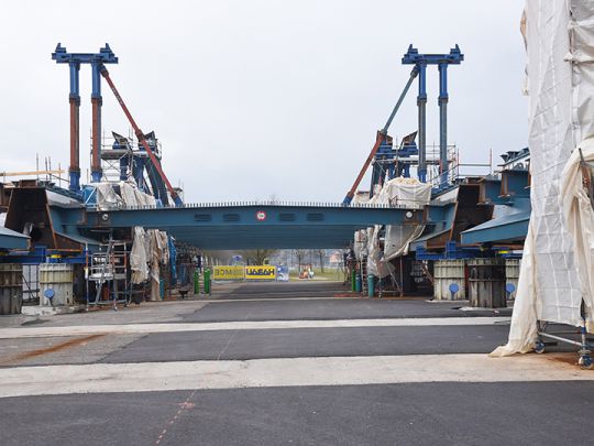 Der mittlere Brückenbogen hat seinen Platz bereits eingenommen.