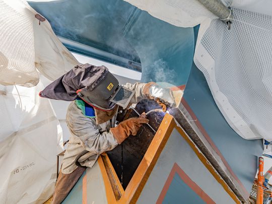 Das Zusammenschweißen der einzelnen Stahlträger ist Präsizionsarbeit.