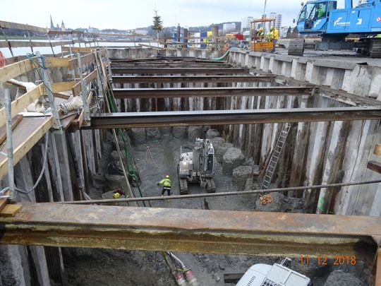 Der Bagger legt die Pfahlköpfe am Grund des Pfeilers frei.