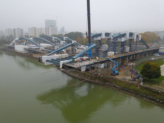 Die Stahlbauarbeiten im Werk gehen voran. Es erfolgt die schrittweise Anlieferung der Großbauteile, hauptsächlich aus dem MCE Werk Slaný. Weiters wird der Aufbau der Montagehilfskonstruktionen für den ersten Brückenbogen durchgeführt.