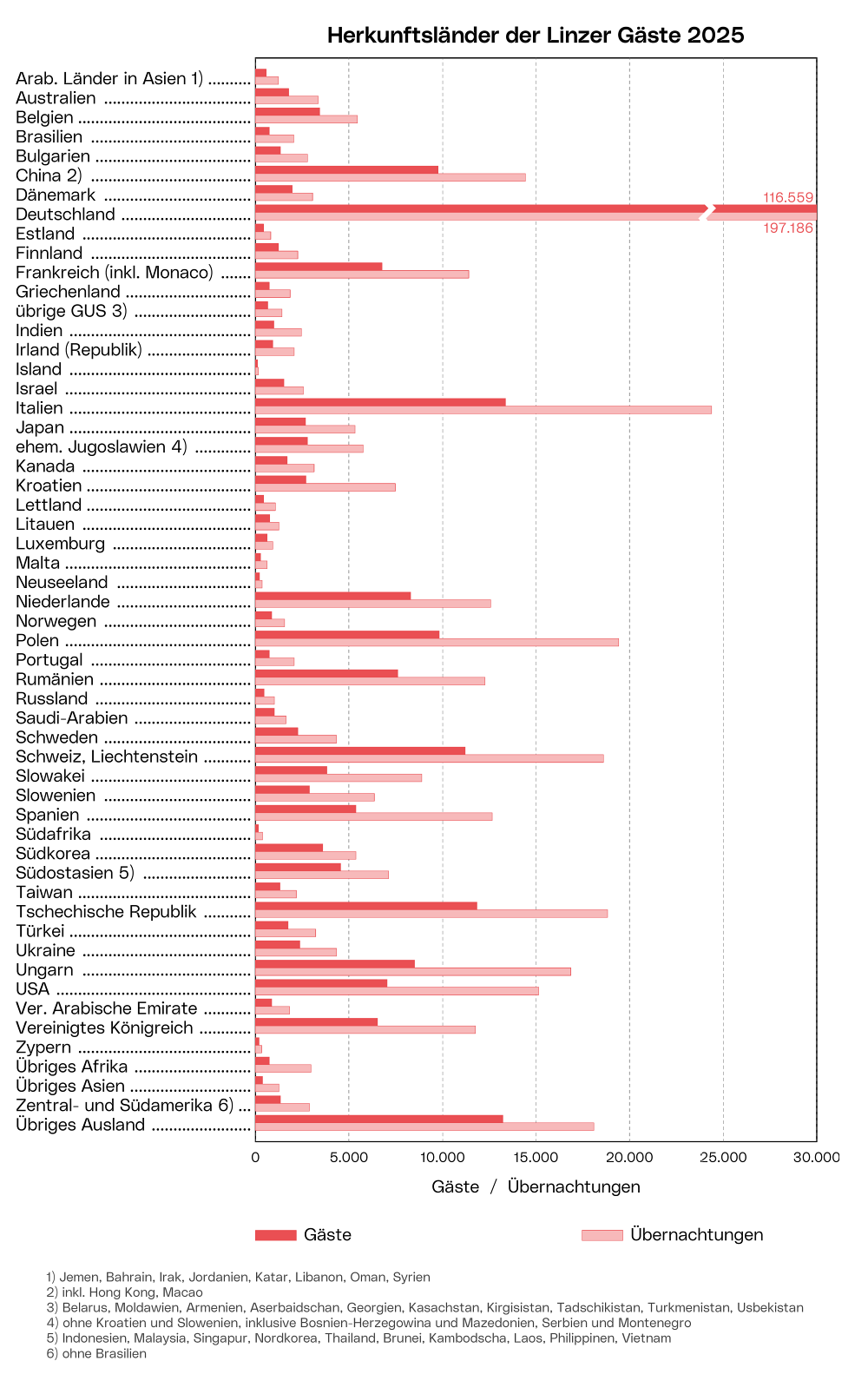 Die Grafik zeigt die Anzahl der Ankünfte und Übernachtungen der Linzer Gäste aufgegliedert nach deren Herkunftsnationen im Jahr 2025. Im Berichtsjahr 2025 kamen 116.559 Touristen aus dem benachbarten Deutschland, 13.356 aus Italien und 11.844 aus der Tschechischen Republik. Die Übernachtungszahlen waren bei den Deutschen mit 197.186, bei den Gästen aus Italien mit 24.385 und bei den Gästen aus Polen mit 19.422 am größten.