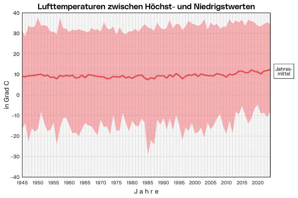 Die folgende Darstellung zeigt ab 2023 je Monat die jeweils tiefste bzw. höchste gemessene Temperatur (Bandbreite) sowie das Monatsmittel und den langjährigen Durchschnittswert der Lufttemperatur.